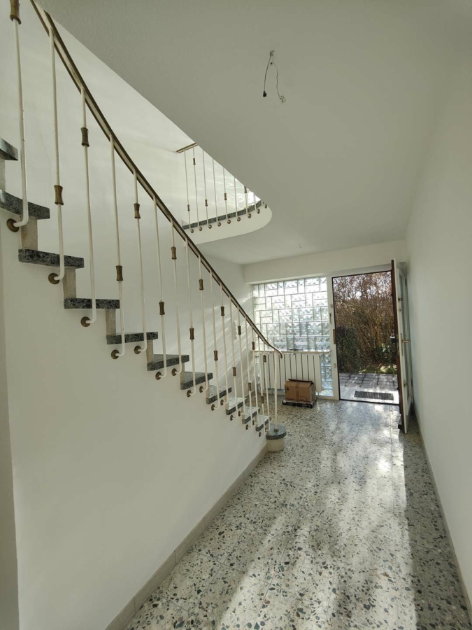 Einige Treppenstufen führen von der Straße zum Haus. Dort angekommen gelangt man durch die Eingangstür in das großzügige und helle Treppenhaus mit Zugang zum Wohnbereich im Erdgeschoss und Treppenaufgang ins Obergeschoss. Unter der Treppe gibt es außerdem einen kleinen Abstellraum.