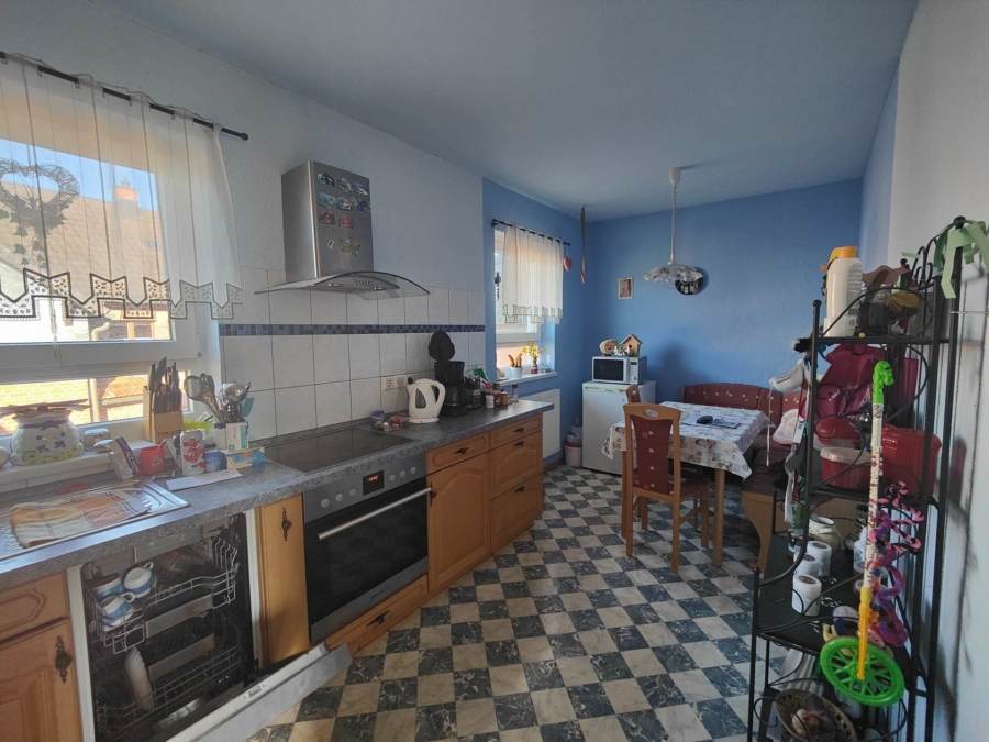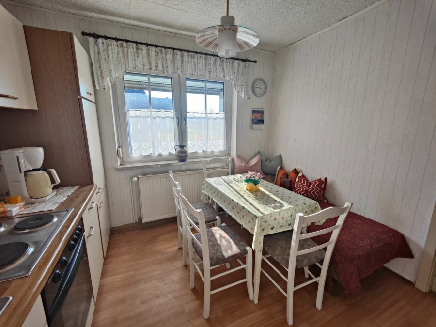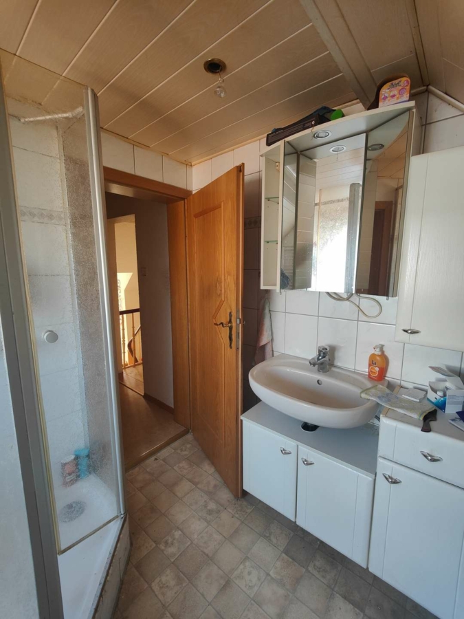 Die Wohnung im Obergeschoss wird zur Zeit noch vom Sohn der Eigentümer bewohnt und bietet Wohn-Esszimmer, Küche, Bad mit Badewanne und Dusche sowie ein Schlafzimmer mit Ankleidebereich und ein Kinderzimmer.