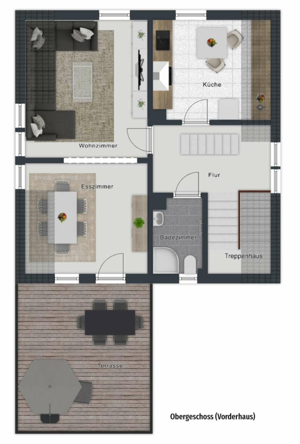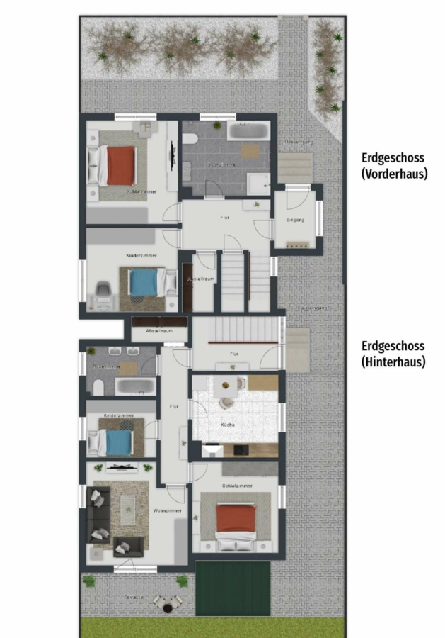 Mit einer Wohnfläche von ca. 150 m² bietet das Vorderhaus genügend Platz für eine Familie. Ungewöhnlich: Schlafzimmer und Badezimmer finden sich im Erdgeschoss; außerdem gibt es hier noch einen kleinen Abstellraum. Das Obergeschoss bietet neben Küche und Wohnzimmer ein Duschbad, ein weiteres Zimmer und eine Dachterrasse. Das Dachgeschoss mit zusätzlicher Wohnfläche ist von hier über eine Raumspartreppe erreichbar.