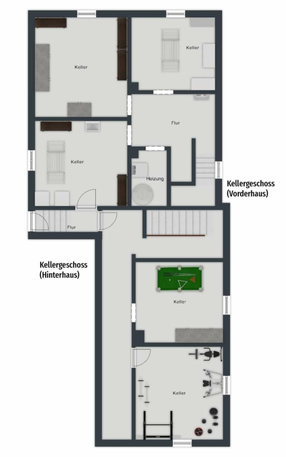 Die Räumlichkeiten des Hauses bieten viel Raum für individuelle Gestaltungsideen und sind hell und freundlich gestaltet. Im Kellergeschoss, das beide Einheiten verbindet finden sich Vorrats- und Abstellräume sowie die Heizungsanlage.