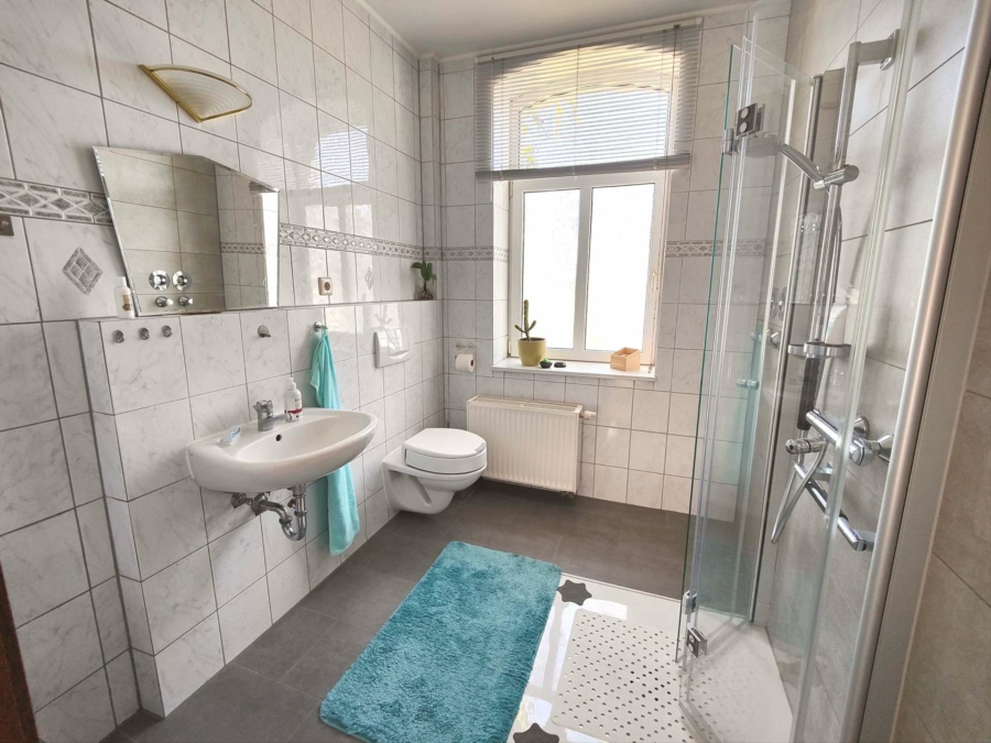 Von hier aus geht es im Erdgeschoss in die Küche, die auch ausreichend Platz für einen Esstisch bietet sowie zwei weitere Zimmer. Auf dieser Etage befindet sich außerdem ein Badezimmer mit bodengleicher Dusche und das geräumige und helle Wohnzimmer mit Erker und Balkon.