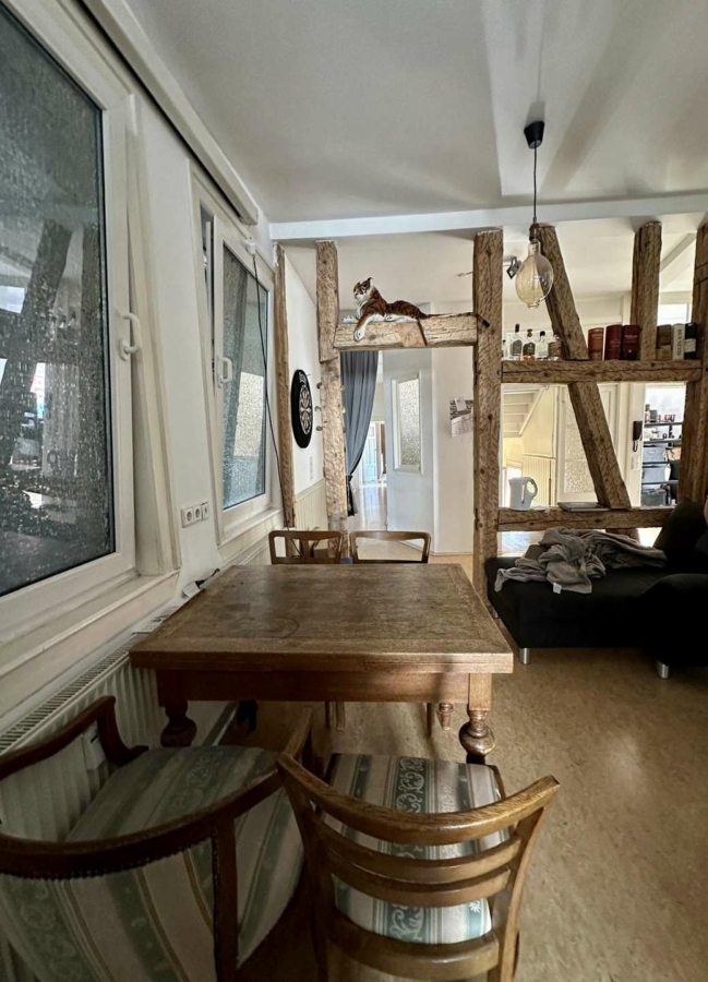 Ein großzügiger offener Flurbereich verbindet die Räume miteinander und bietet durch original Fachwerkbalken abgetrennt einen zusätzlichen, charmanten Wohn-/Essbereich.
