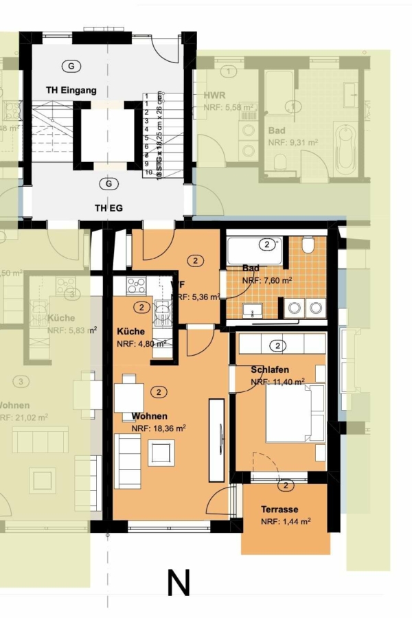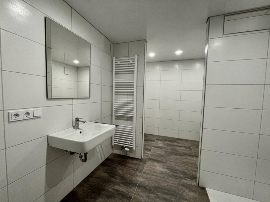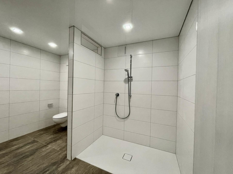Die neuwertige 2-Zimmer-Wohnung befindet sich im ersten Obergeschoss und bietet eine Wohnfläche von ca. 49 m². Vom großzügig geschnittenen Flur aus erreichen Sie das helle Wohnzimmer sowie das modern ausgestattete Badezimmer mit bodengleicher Dusche, WC, Waschbecken und Waschmaschinenanschluss.